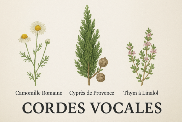 Solution buvable avec les huiles essentielles de Camomille Romaine, Cyprès de Provence et Thym à Linalol, qui apaisent les cordes vocales.