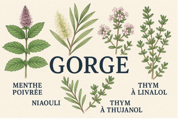 Solution buvable aux huiles essentielles de Menthe Poivrée, Niaouli, Thym à Linalol et Thym à Thujanol, qui calme la gorge et aide à la respiration.