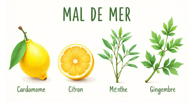Solution buvable avec les huiles essentielles de Cardamome, Citron, Menthe Poivrée et _Gingembre, qui aident à éviter les nausées causées par le mal de mer.